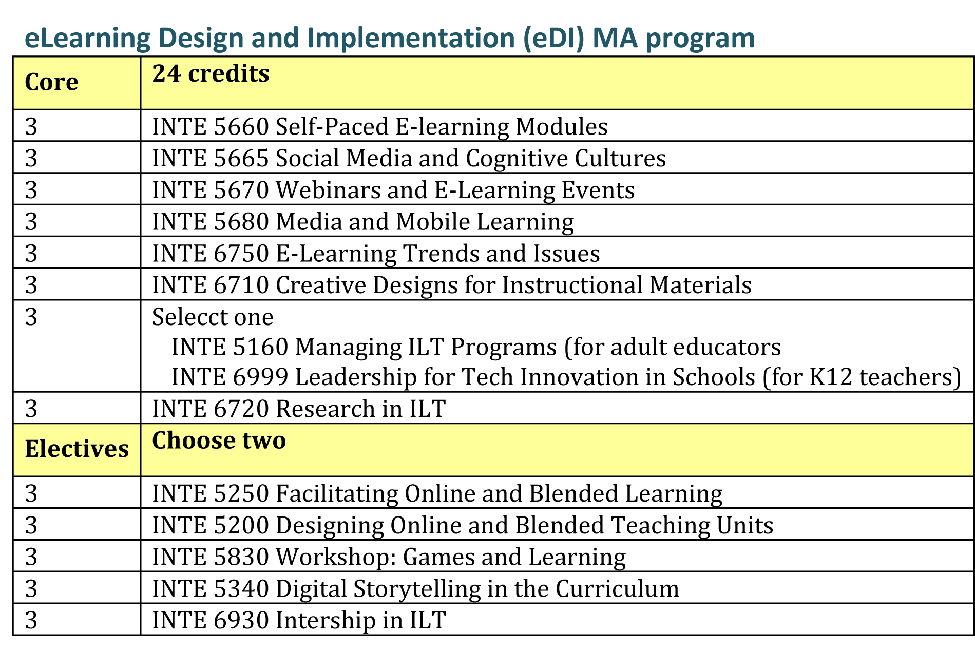 The eLearning program options are offered entirely online. Good first-term courses: INTE 5665, 5340, 5250, and 5200. INTE 5660 could be taken early (although web development can be fairly demanding). INTE 6750 could also be an early course. Avoid 6720 and 6750 the same term - the projects are too similar.
